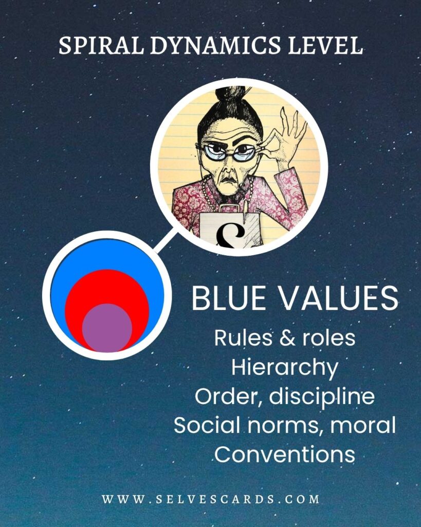 Blue is about rules and roles, respecting the traditions and formal hierarchies. The core values of blue are order, discipline and obedience to superiors.